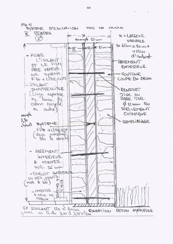 A savoir que si les anciennes pierre sont repositionnés sur 25 cm d’épaisseur avec une fondation hydrofuge, on pourra considérer que sur cette épaisseur le mur est autoporteur. Bien sur on rajoutera des tiges filetés en liaison avec l’autre parois 25cm d’épaisseur, afin de créer un bloc 65cm en moyenne, dans notre cas ( 25pierre +15 isolant +25pierre).